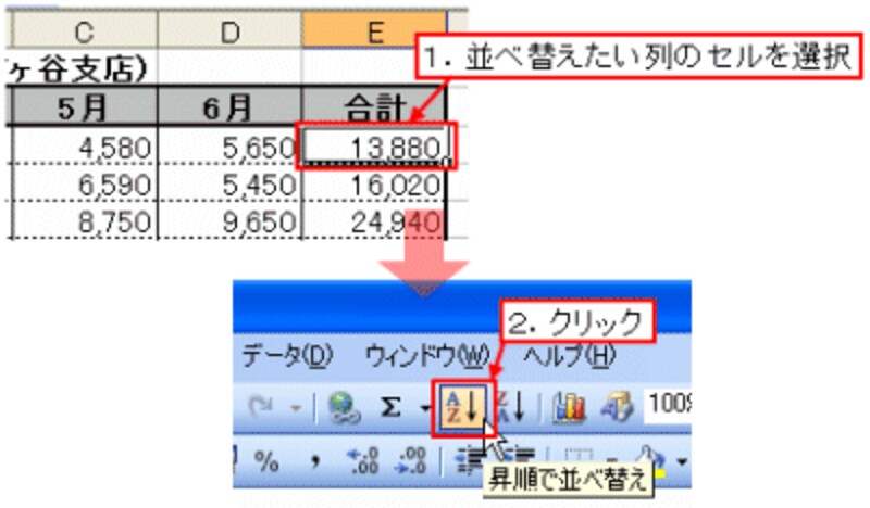 | いくつかメニューをたどって実行するのは手間がかかる。ここでは、並べ替えの操作を6手順で実行している |