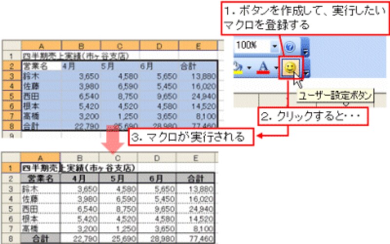 このようなボタンをマクロ実行用に追加することができます。そして、追加したボタンにマクロを登録して、ボタンをクリックしたときにマクロが実行できるように設定できます。