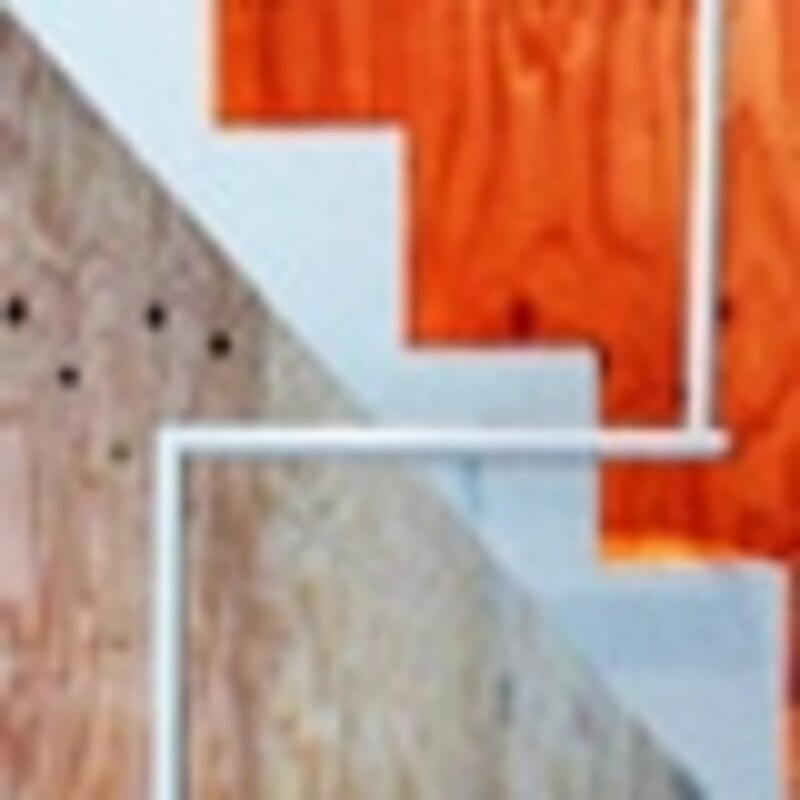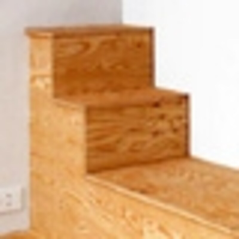 1. 2階は洗濯室と吹抜けがひとつながりになっている。 2. 収納が造り付けになっている洗濯室。フェンスの高さは70cm。写真:能作淳平建築設計事務所 3. 鉄とラーチ合板で造られたシンプルな階段。 4. 全ての部材がラーチ合板で造られた1階の階段室。 |