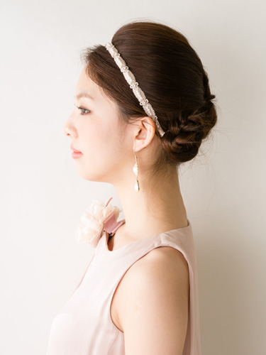 ピンクベージュのレースに、パールをあしらったカチューシャ。つけるだけで、よそ行きの印象に。上品なデザインだから、年上の方にお呼ばれされたときにも大活躍。トップにボリュームを出したスタイルを邪魔しない、ほどよい細さも使いやすい。