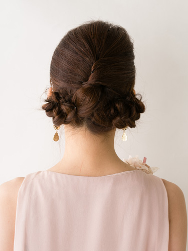 おさげを丸めて、ピンで留めただけのスタイルです。大人っぽく仕上げるポイントは、トップのボリューム感と、三つ編みのほぐれた質感。きっちりしすぎないラフさを出すことで、大人の余裕を感じさせる、エレガントなスタイルが完成します。