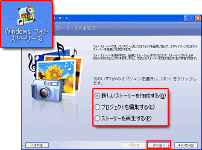 [Windows フォトストーリー3へようこそ]の画面で、[新しいストーリーを作成する]にチェックを入れて[次へ]ボタンをクリックします。↓