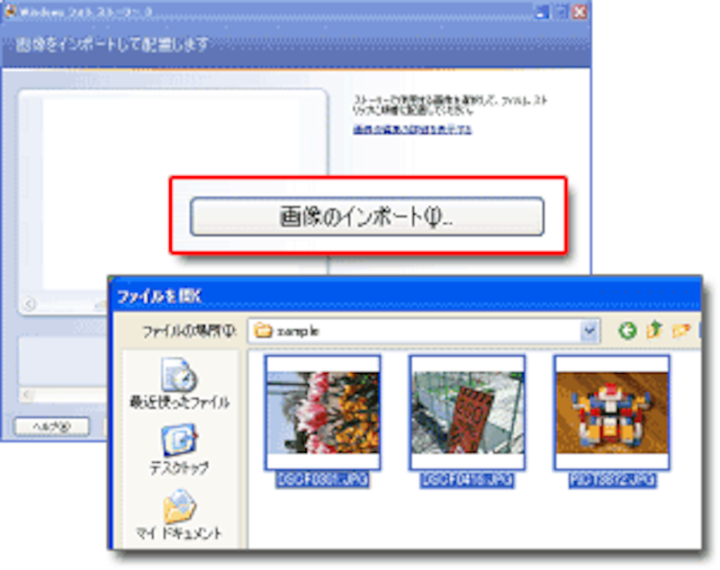 [画像のインポート]ボタンをクリックして、好きな写真を数枚取り込みます。「JPEG」「ビットマップ」「GIF」などの一般的な画像ファイルを取り込めます。