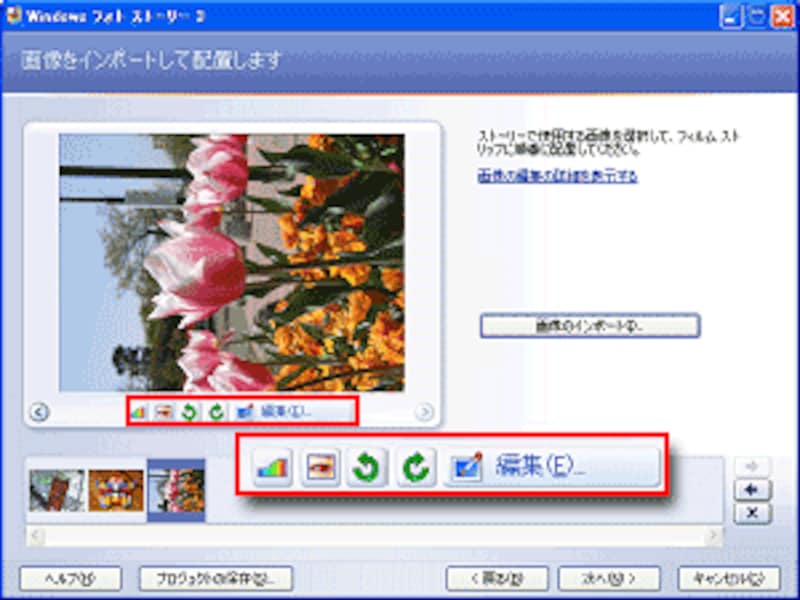 取り込んだ写真のプレビューの下に配置されている、「カラー バランスの補正」「赤目補正」「画像を右回りまたは左回りに回転」のボタンをクリックすると、自動的に補正ができます。↓