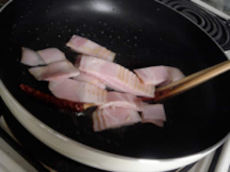 フライパンにオリーブオイルと赤唐辛子(丸まま)を入れて熱し、2~3センチに刻んだベーコンを加えてほぐすように焼き付ける。
