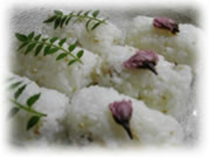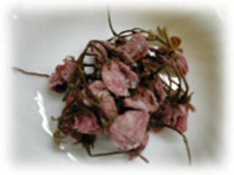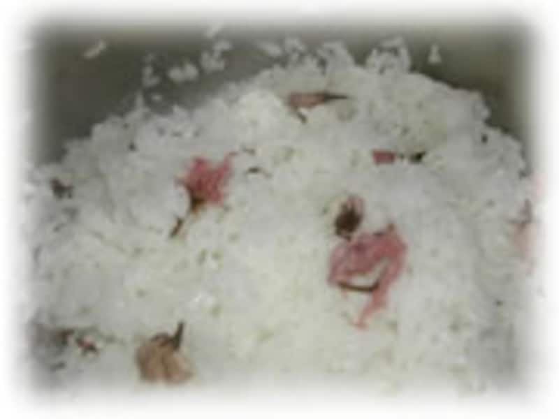 | 材料:4人分 米3カップ、ダシ昆布10cm、酒大さじ1、塩小さじ1/2、水3カップ。 | 桜の花の塩漬け40g:桜の花の塩漬けは、さっと水洗いをして布巾で水気をとり、花びらはそのまま、茎は細かく切っておきます。 | |