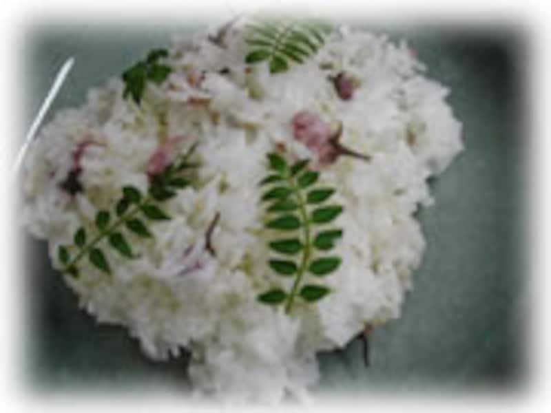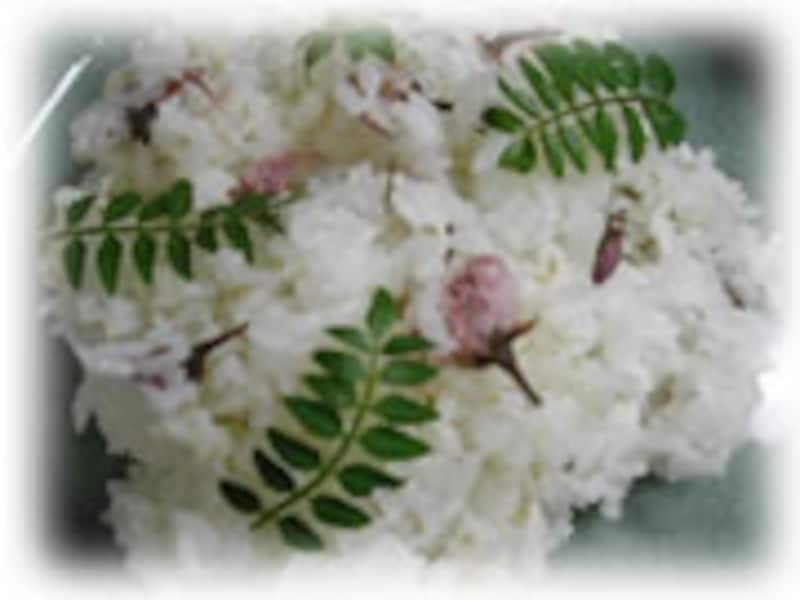 | ご飯は昆布ダシで炊き上げて蒸らしておきます。そこへ水気をとった桜の花の塩漬け、細かく切った茎を混ぜ合わせます。 | 大皿に、桜ご飯を盛り付け木の芽を飾ります。 | |